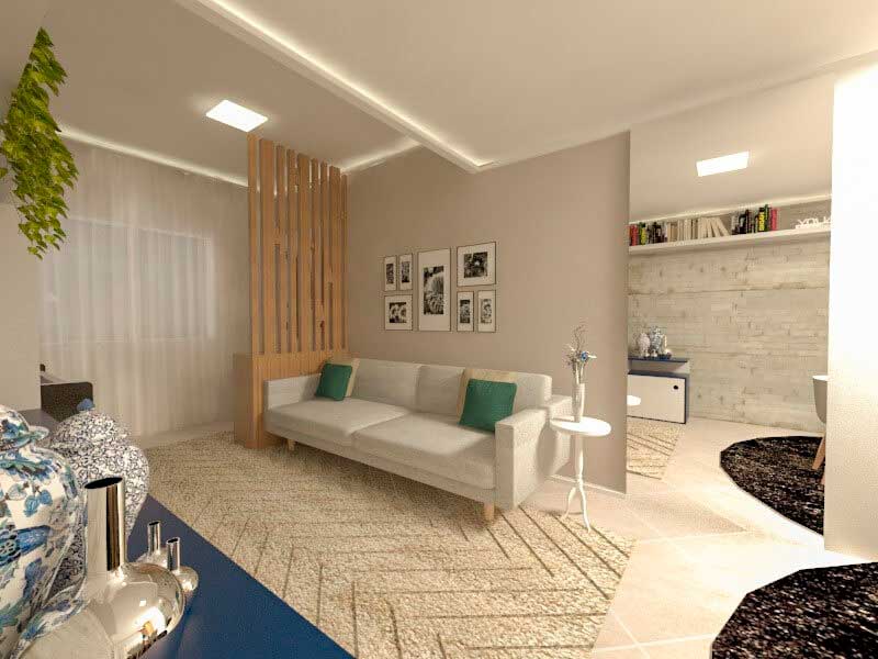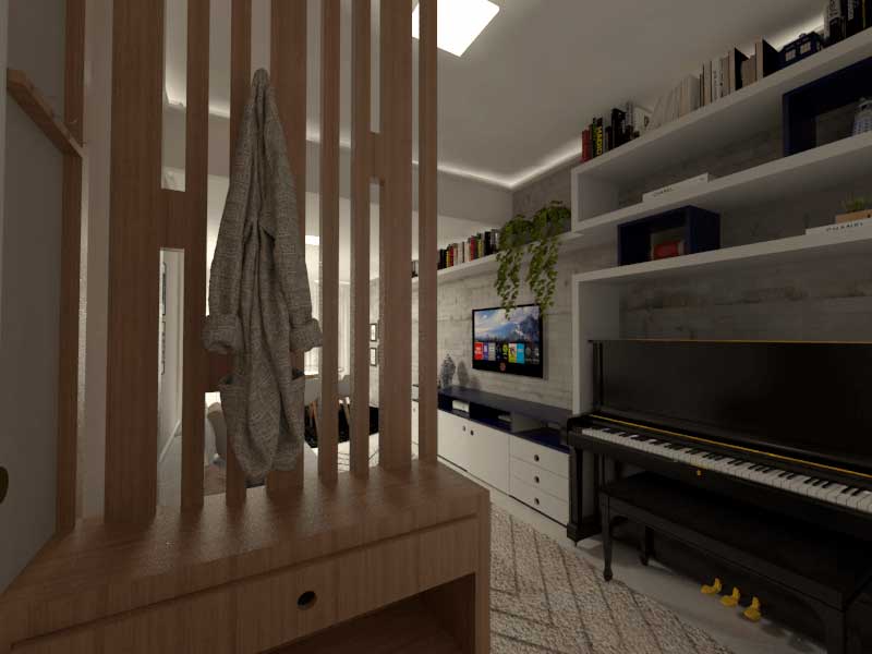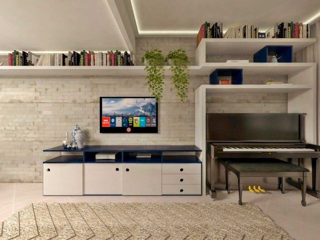 Estilo vintage e moderninho? Totalmente possível! Os clientes são colecionadores, adoram viajar e têm muita personalidade, sendo assim, no projeto buscou-se deixar o lar com a cara do casal e também melhorar a circulação dispondo corretamente os móveis e redesenhando todo o layout dos espaços, integrando-os com a mesma proposta conceitual e trazendo maior amplitude, organização e também um design especialmente desenvolvidos para eles. A solicitação era manter o piano e nada mais justo que incorporá-lo na decoração, portanto, o rack e a estante abraçam o piano para que seja criada uma unidade na parede revestida com tijolinho em vista.